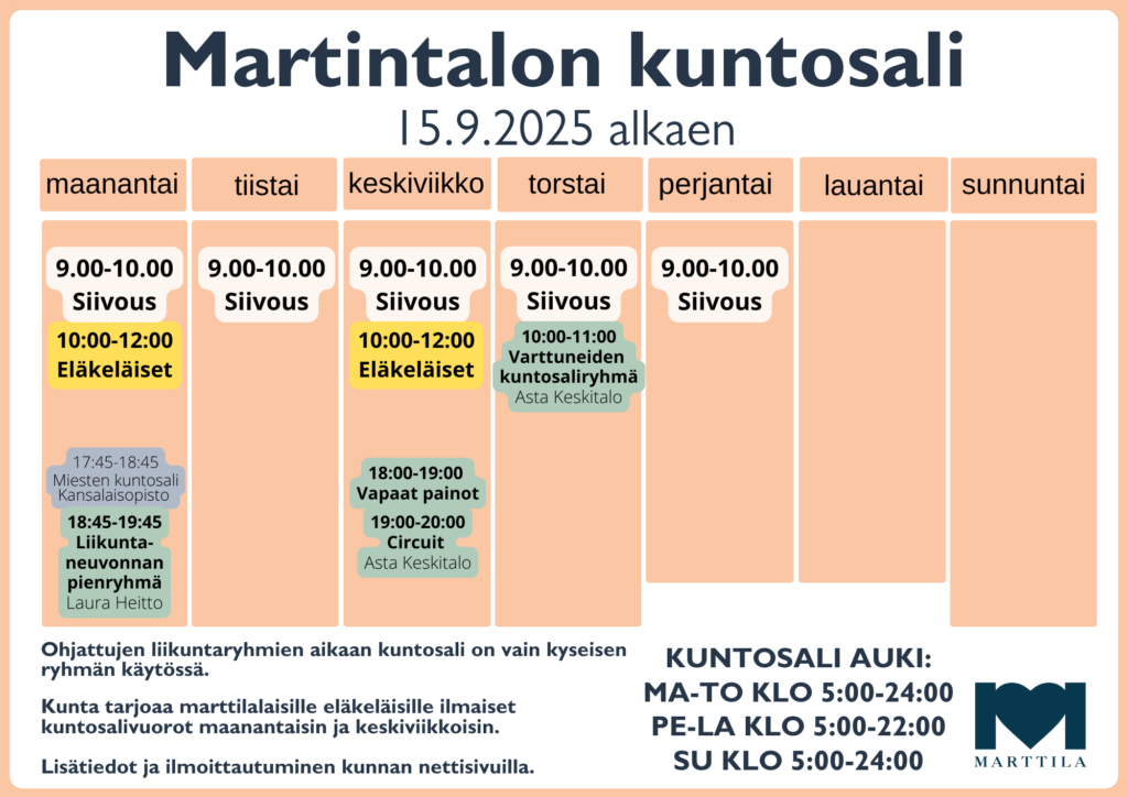 - Liikuntaneuvonnan pienryhmä, ma klo 18:45-19:45, tarkoitettu lähtökohtaisesti liikuntaneuvonnan asiakkaille. Tietoa liikuntaneuvonnasta täältä: Hyvinvoinnin edistäminen – Marttilan kunta