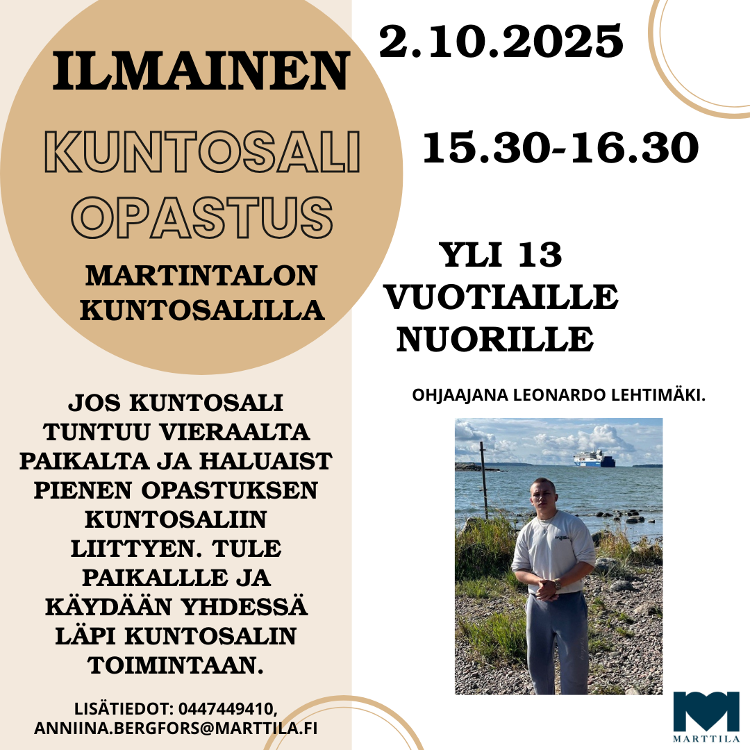 Liikunnanohjausta opiskeleva Leonardo on Marttilan kunnalla harjoittelussa. Ensi viikon torstaina tulossa Leonardon ohjaamana kuntosaliopastus nuorille. Opastuksessa saat vinkkejä kuntosaliharjoitteluun ja käydään yhdessä läpi eri kuntosaliliikkeitä. Tule tutustumaan kuntosaliin ja kysymään vinkkejä harjoitteluun!